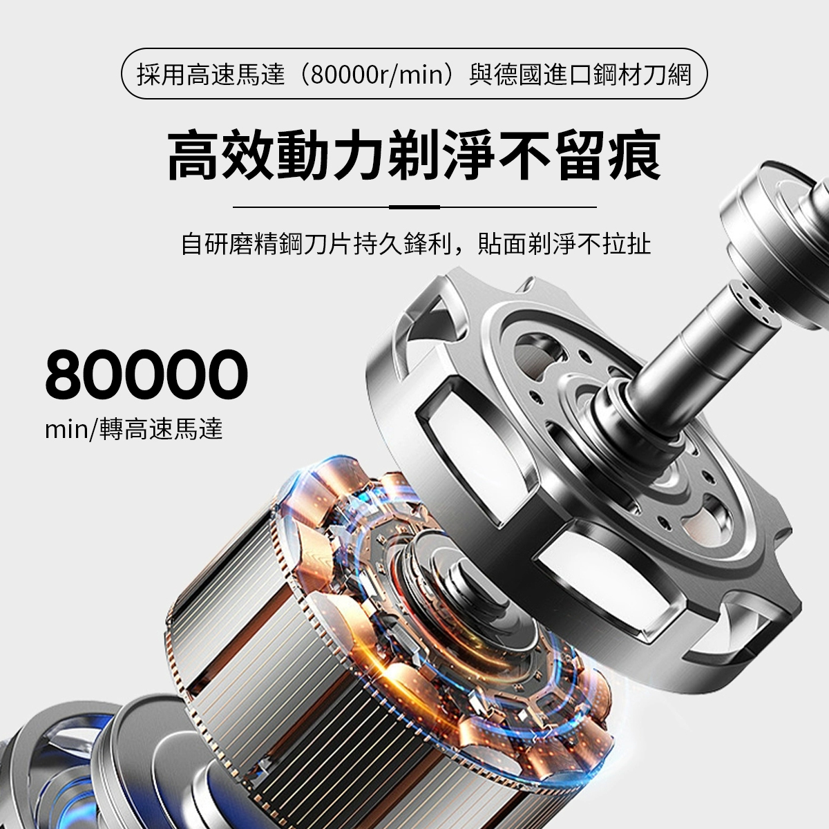 • 高效動力剃淨不留痕 採用高速馬達(80000 r/min)與德國進口鋼材刀網,自研磨精鋼刀片持久鋒利,貼面剃淨不拉扯。